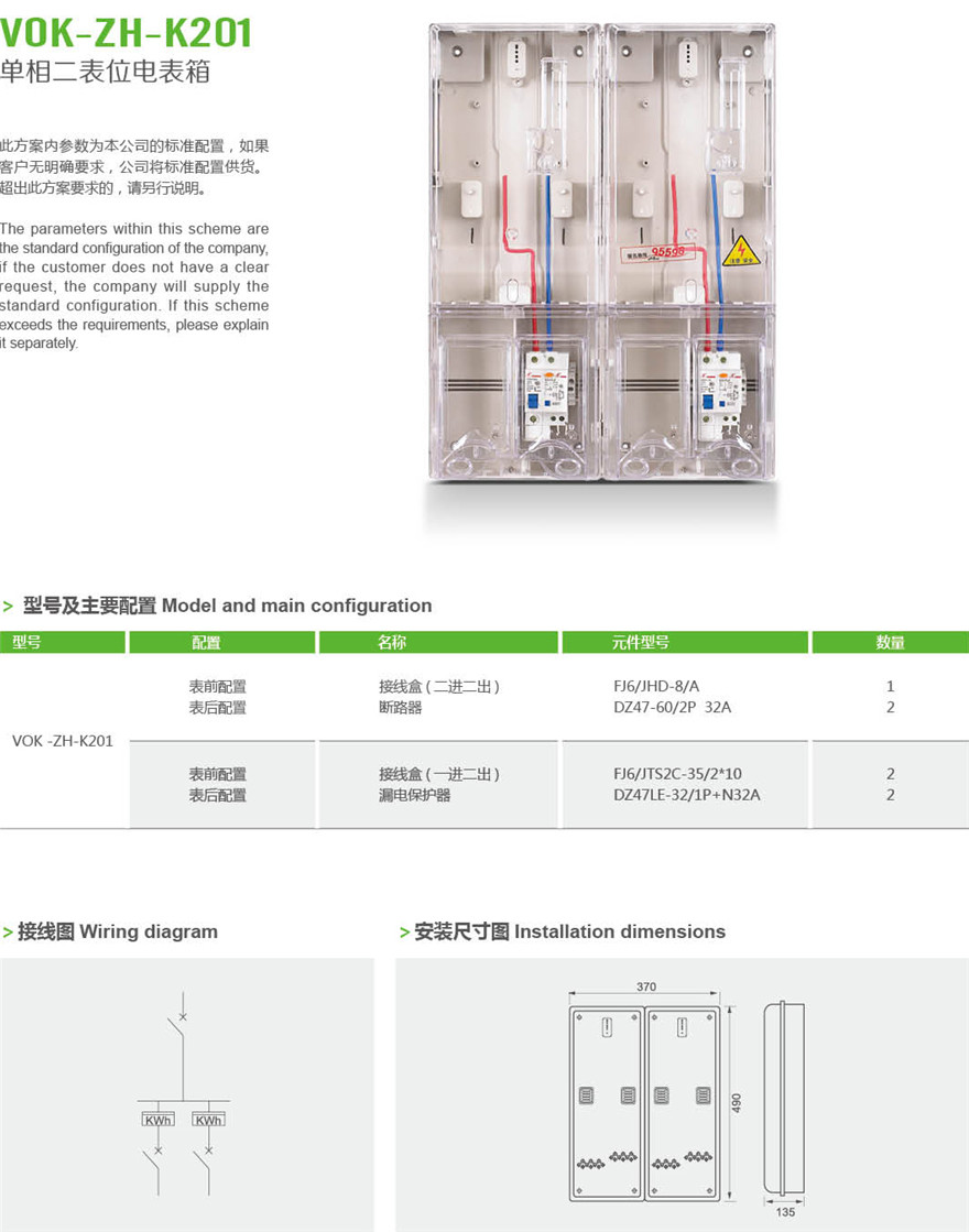 VOK-ZH-K201 单相二表位计量箱